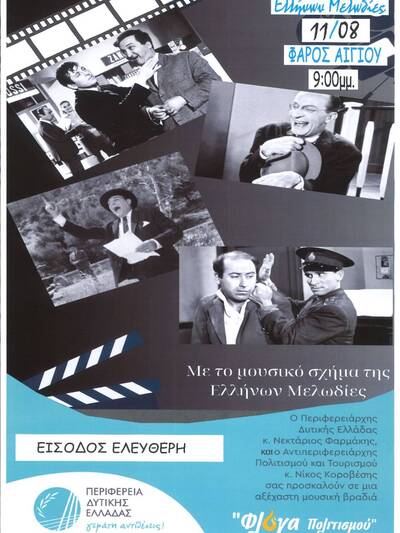 Μια ιδιαίτερη μουσικοχορευτική παράσταση-αφιέρωμα στον Ελληνικό Κινηματογράφο, με τίτλο «Ελλήνων Μελωδίες», θα πραγματοποιηθεί την Παρασκευή 11 Αυγούστου στις 9μ.μ. στον παλαιό λιμένα Αιγίου (Φάρος).