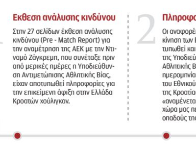 Ενα εικοσιτετράωρο πριν από τα δραματικά γεγονότα έξω από την OPAP Arena, η Υποδιεύθυνση Αντιμετώπισης Αθλητικής Βίας συνέταξε έκθεση ανάλυσης κινδύνου (Pre-Match Report) για την αναμέτρηση της ΑΕΚ με την Ντιναμό Ζάγκρεμπ. Αριθμεί 27 σελίδες και σ’ αυτήν είχαν αποτυπωθεί πληροφορίες για την επικείμενη άφιξη στην Ελλάδα Κροατών χούλιγκαν.