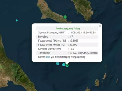 Ο σεισμός των 3,7 ρίχτερ έγινε στις 16.20 με επίκεντρο 42 χιλιόμετρα βόρεια – βορειοανατολικά της Σκιάθου και εστιακό βάθος 15,9 χιλιόμετρα.
