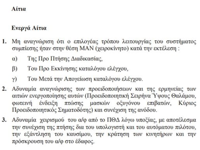 Στα ενεργά αίτια ήταν: Η παραμονή του διακόπτη συμπίεσης του αεροσκάφους στη χειροκίνητη ρύθμιση κατά τον έλεγχο πριν από την πτήση. Αυτό είχε ως επακόλουθο να μειώνονται όσο περνούσε η ώρα τα επίπεδα της ατμοσφαιρικής πίεσης και κατ' επέκταση τα επίπεδα του οξυγόνου στο εσωτερικό του αεροπλάνου.