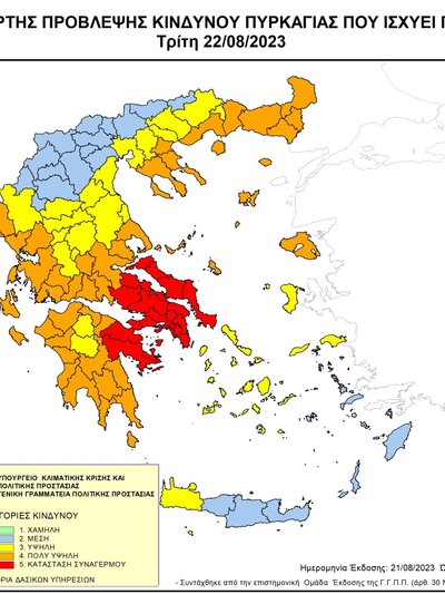 Πολύ υψηλός κίνδυνος πυρκαγιάς (κατηγορία 4) προβλέπεται για την Περιφέρεια Δυτικής Ελλάδας (Π.Ε. Αιτωλοακαρνανίας, Αχαΐας και Ηλείας) και για την Τρίτη 22 Αυγούστου 2023 σύμφωνα με τον Χάρτη Πρόβλεψης Κινδύνου Πυρκαγιάς της Γενικής Γραμματείας Πολιτικής Προστασίας.