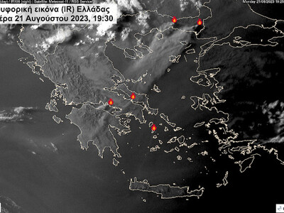 Σε εικόνα του ευρωπαϊκού δορυφόρου METEOSAT-11 αποτυπώνεται η δριμύτητα και η έκταση των δασικών πυρκαγιών που εκδηλώθηκαν νωρίτερα μέσα στη χθεσινή ημέρα (21/8) και παραμένουν ενεργές, με τον καπνό να έχει καλύψει τον ουρανό αρκετών περιοχών της χώρας μας.