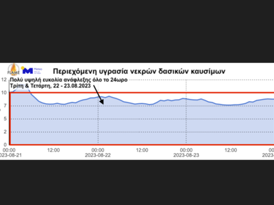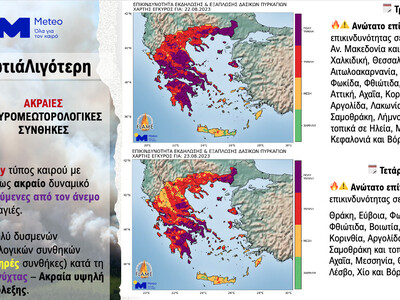 Για την Τετάρτη (23/8, ανώτατο επίπεδο επικινδυνότητας εκδήλωσης και εξάπλωσης δασικών πυρκαγιών αναμένουμε σε Θράκη, Εύβοια, Φωκίδα, Φθιώτιδα, Βοιωτία, Αττική, Κορινθία, Αργολίδα, Λακωνία, Σαμοθράκη και τοπικά σε Ηλεία, Αχαΐα, Μεσσηνία, Θεσσαλία, Λέσβο, Χίο και Βόρειες Κυκλάδες.