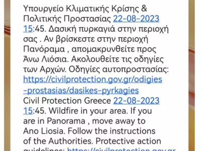 Λίγο μετά τις 12 το μεσημέρι της Τρίτης (22.08.23) εστάλη μήνυμα από 112 για εκκένωση προς τα Άνω Λιόσια. «Δασική πυρκαγιά στην περιοχή σας. Εάν βρίσκεστε στη Φυλή απομακρυνθείτε προς Άνω Λιόσια. Ακολουθείτε τις οδηγίες των αρχών», αναφέρει το μήνυμα.