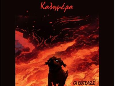 "Οι εντελώς αθώοι" γράφει ο Αρκάς, έχοντας ζωγραφίσει ένα σκυλάκι να τρέχει να σωθεί από τις φλόγες.