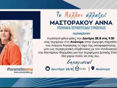 Συγκεκριμένα, στο κάλεσμά της, αναφέρει: "Η αντίστροφη μέτρηση για την επόμενη μεγάλη πολιτική εκδήλωση της Αννας Μαστοράκου ήδη ξεκίνησε. Η πρόεδρος του Ιατρικού Συλλόγου Πατρών και υποψήφια περιφερειακή σύμβουλος με τον συνδυασμό «Μπροστά για όλους» του Περιφερειάρχη Νεκτάριου Φαρμάκη θα διοργανώνει συγκέντρωση-συνάντηση με υποστηρικτές της και φίλους της παράταξης στο cafe-bar-restaurant «Ανώνυμο» στον Λόγγο Αιγιάλειας. Η εκδήλωση θα πραγματοποιηθεί τη Δευτέρα 28/8 στις 21:30 και η Αννα Μαστοράκου θα αναπτύξει μέσα σε χαλαρό και οικογενειακό κλίμα, τις θέσεις και το πρόγραμμα του συνδυασμού «Μπροστά για όλους», αλλά και το δικό της όραμα και τη φιλοσοφία της για την ανάπτυξη της περιοχής μας".