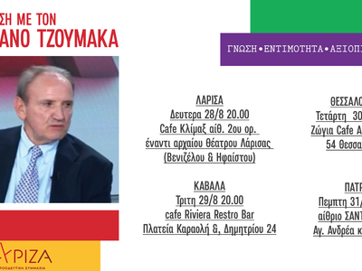 "Την Πέμπτη 31.8 ο υποψήφιος Πρόεδρος του ΣΥΡΙΖΑ – Προοδευτική Συμμαχία Στέφανος Τζουμάκας , στο πλαίσιο της περιοδείας του στην Αχαΐα θα επισκεφθεί την Πάτρα και σας προσκαλεί: