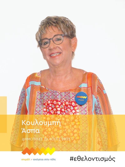 «Συμμετέχω στις Δημοτικές Εκλογές 2023 για να στηρίξω την περιοχή όπου μένω, το Πετρωτό Αχαΐας. Στόχος μου είναι η ανάδειξη του τόπου μου και η φροντίδα του με κάθε τρόπο. Επιλέγω το σπιράλ γιατί σε αυτό βλέπω μια ομάδα ανθρώπων έτοιμη να αλλάξει προς το καλύτερο την πόλη μας και να αναβαθμίσει την ποιότητα ζωής όλων μας.»