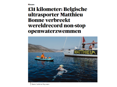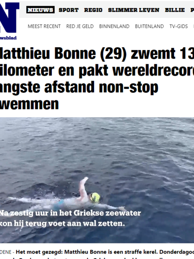 Όπως σημειώνουν βελγικά μέσα ενημέρωσης, , ο Ματιέ Μπον κατέρριψε το παγκόσμιο ρεκόρ κολύμβησης στη θάλασσα χωρίς διακοπή. Ειδικότερα, σε 60 ώρες και 55 λεπτά κολύμπησε 131 χιλιόμετρα σε διαδρομή στον Κορινθιακό Κόλπο.