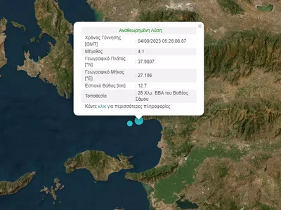 Ο σεισμός ήταν μεγέθους 4,1 της κλίμακας Ρίχτερ σημειώθηκε ανοιχτά της Σάμου στις 08:26 ώρα Ελλάδος σε απόσταση 297 χλμ. ανατολικά των Αθηνών, όπως ανακοίνωσε το Γεωδυναμικό Ινστιτούτο.