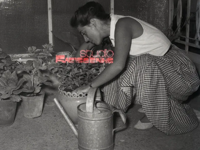 Στο ασπρόμαυρο στιγμιότυπο, η ηθοποιός βρίσκεται στον κήπο του σπιτιού της και ποτίζει τα λουλούδια.