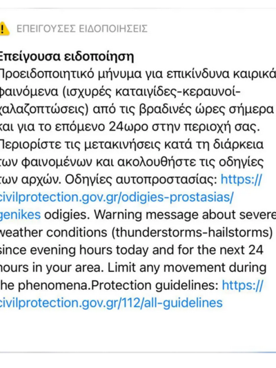 Η σύσταση τους κατοίκους των συγκεκριμένων περιοχών που ήχησε το 112 είναι να περιορίσουν τις μετακινήσεις τους κατά τη διάρκεια των έντονων φαινομένων και να ακολουθούν τις οδηγίες των Αρχών καθώς η κακοκαιρία Daniel απειλεί με μεγάλες βροχοπτώσεις και υπάρχει κίνδυνος πλημμύρας.
