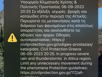 Λίγο πριν τις 20.30 το βράδυ της Τετάρτης (6/9) ήχησε το 112 στα κινητά των κατοίκων της Αττικής, με προειδοποίηση για την κακοκαιρία Daniel που «χτυπάει» τη χώρα.