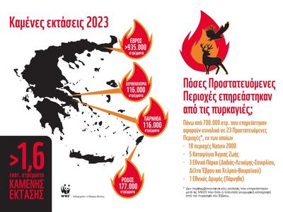 Από τα 1,6 εκατομμύρια στρέμματα που κάηκαν στην Ελλάδα το φετινό δραματικό καλοκαίρι, τα 700.000 στρέμματα αφορούν προστατευόμενες περιοχές, από τις οποίες ένα σημαντικό μέρος είχε ξανακαεί πρόσφατα και θα είναι δύσκολο να αναγεννηθεί, διαπιστώνει το WWF Ελλάς στην πρώτη αποτίμηση για τις φετινές πυρκαγιές.