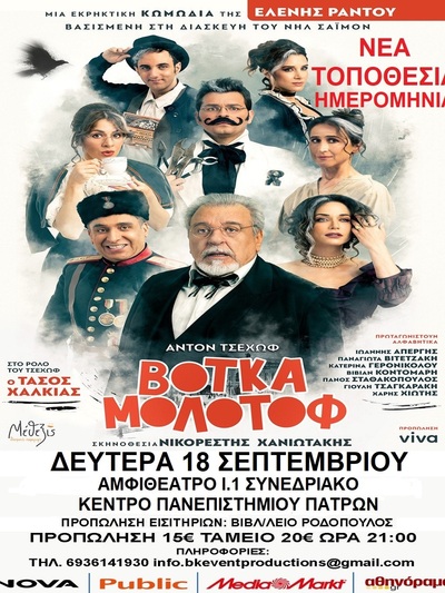 Την Δευτέρα 18 Σεπτεμβρίου 2023 στο Αμφιθέατρο Αίθουσα Ι.1 στο Συνδεριακό Κέντρο του Πανεπιστημίου Πατρών στο Ρίο στις 21:00 θα πραγματοποιηθεί, όπως έγινε γνωστό με σχετική ανακοίνωση, η θεατρική παράσταση «Βότκα Μολότοφ» με τον Τάσο Χαλκιά που αρχικά ήταν προγραμματισμένη για την Πέμπτη 7/9 στο Θερινό Δημοτικό Θέατρο του Δήμου αλλά αναβλήθηκε λόγω της κακοκαιρίας.