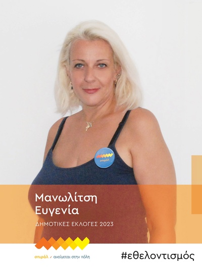 «Ζω στο Άνω Καστρίτσι τα τελευταία 18 χρόνια. Γνωρίζω τα προβλήματα και βιώνω καθημερινά την υποβάθμιση αυτού του υπέροχου τόπου. Στηρίζω το σπιράλ γιατί από την πρώτη στιγμή που γνώρισα τον Πέτρο Ψωμά είδα έναν άνθρωπο νέο, δυναμικό, διορατικό, με νέες ιδέες και ηθικές αξίες που θέλει να δει την πόλη που αγαπά να εξελίσσεται όπως της αξίζει.»