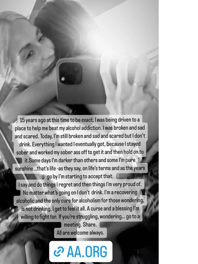 Λέω και κάνω πράγματα για τα οποία μετανιώνω και μετά πράγματα για τα οποία είμαι πολύ περήφανη. Ό,τι κι αν συμβαίνει, δεν πίνω. Είμαι μία αλκοολική σε ανάρρωση και η μόνη θεραπεία για τον αλκοολισμό για όσους αναρωτιούνται, δεν είναι το ποτό. Το νιώθω. Μια κατάρα και μια ευλογία είναι για την οποία είμαι διατεθειμένη να πολεμήσω. Αν δυσκολεύεστε, αναρωτιέστε… πηγαίνετε σε μια συνάντηση. Μοιραστείτε το. Όλοι είναι πάντα ευπρόσδεκτοι».