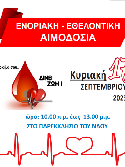 Η αιμοδοσία θα πραγματοποιηθεί από τις 10 το πρωί έως τις 3 το μεσημέρι.