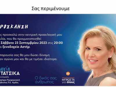 Η προεκλογική εκστρατεία της υποψήφιας περιφερειακής συμβούλου με την παράταξη του Νεκτάριου Φαρμάκη, «Μπροστά για Όλους», Γεωργίας Ντάτσικα, θα κορυφωθεί το ερχόμενο Σάββατο, 23 Σεπτεμβρίου.