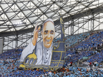 Κατά την άφιξή του, ένα τεράστιο «κορεό» ξεδιπλώθηκε από τους οπαδούς της Ολιμπίκ Μαρσέιγ, που απεικόνιζε την προτομή του ποντίφικα δίπλα στην «Καλή Μητέρα» όπως αποκαλείται η Βασιλική Νοτρ-Νταμ-Ντε-Λα-Γκαρντ, η εκκλησία της Παναγίας προστάτιδας της πόλης. Πίσω από αυτό το πανό, που ξεδιπλωνόταν από την οροφή της νότιας πλευράς, οι χιλιάδες θεατές σχεδίασαν με χαρτόνια πρώτα έναν μπλε σταυρό σε λευκό φόντο, τη σημαία της Μασσαλίας, προτού γράψουν εκεί ένα τεράστιο «Ευχαριστώ» με κίτρινα γράμματα που σχηματίζονταν από χρυσά χαρτιά.