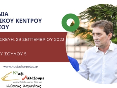 Ο υποψήφιος Περιφερειάρχης Δυτικής Ελλάδας Κώστας Καρπέτας θα μιλήσει στο Αγρίνιο την Παρασκευή 29 Σεπτεμβρίου στις 19.30 στα εγκαίνια του εκλογικού κέντρου της παράταξης «Μαζί Αλλάζουμε – Δυτική Ελλάδα», ( Πάνου Σούλου 5).