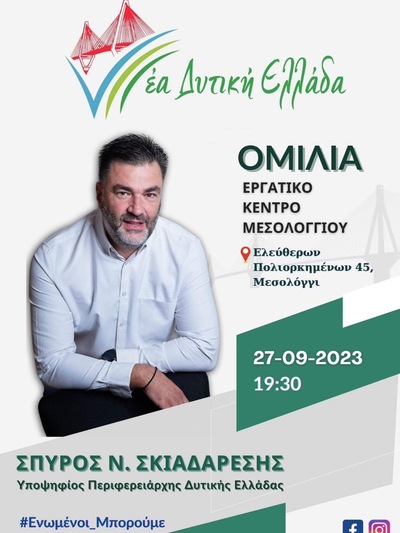 Λίγες ημέρες μετά τα εγκαίνια του εκλογικού κέντρου του συνδυασμού στο Αγρίνιο, ο υποψήφιος Περιφερειάρχης Δυτικής Ελλάδος, επικεφαλής του συνδυασμού «Νέα Δυτική Ελλάδα- Ενωμένοι Μπορούμε» επιστρέφει στην Αιτωλοακαρνανία και συγκεκριμένα, στο Μεσολόγγι, όπου στις 7.30 το απόγευμα θα μιλήσει στο Εργατικό Κέντρο (Ελεύθερων Πολιορκημένων 45).