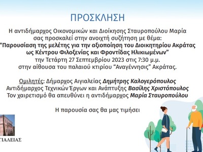 Ανοιχτή συζήτηση με θέμα την παρουσίαση μελέτης για την αξιοποίηση του Διοικητηρίου Ακράτας ως Κέντρου Φιλοξενίας και Φροντίδας Ηλικιωμένων, θα πραγματοποιηθεί την Τετάρτη 27 Σεπτεμβρίου στις 7.30 μ.μ. στην αίθουσα του παλαιού κτιρίου του Συλλόγου "Αναγέννησις" στην Ακράτα.
