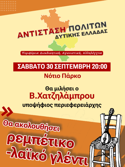 Στην εκδήλωση θα μιλήσει ο υποψήφιος Περιφερειάρχης Δυτικής Ελλάδας Βασίλης Χατζηλάμπρου.
