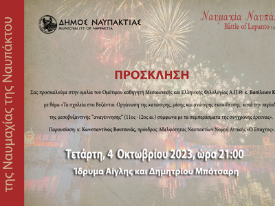 Ο Δήμος Ναυπακτίας ενημερώνει με ανακοίνωση του ότι, στο πλαίσιο των Εορτασμών της 452ης Επετείου της Ναυμαχίας της Ναυπάκτου, απόψε Τετάρτη, 4 Οκτωβρίου 2023 και ώρα 21:00 στο Ίδρυμα Δημητρίου και Αίγλης Μπότσαρη, ο Ομότιμος Καθηγητής Μεσαιωνικής και Ελληνικής Φιλολογίας ΑΠΘ κ. Βασίλειος Κατσαρός πραγματοποιεί Ομιλία με θέμα: «Τα σχολεία στο Βυζάντιο. Οργάνωση της κατώτερης, μέσης και ανώτερης εκπαίδευσης κατά την περίοδο της μεσοβυζαντινής «αναγέννησης» (11ος – 12ος αιώνας), σύμφωνα με τα συμπεράσματα της σύγχρονης έρευνας».