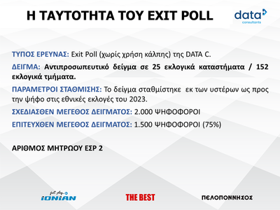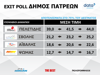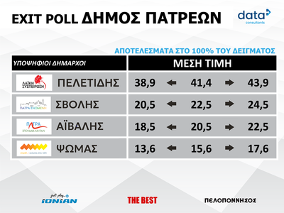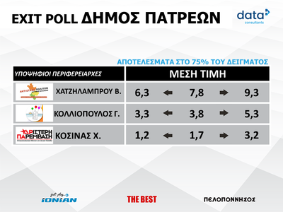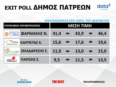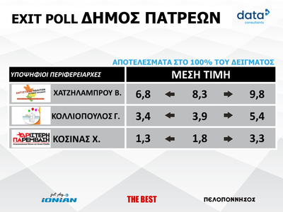 Στις 19.00 με μεγάλο ενδιαφέρον, θα παρουσιαστεί το μοναδικό exit poll για τον δήμο της Πάτρας αλλά και την Περιφέρεια Δυτικής Ελλάδας που αφορά στο εκλογικό σώμα στην Πάτρα με αναγωγή σε όλες τις Περιφερειακές Ενότητες, από την εταιρεία δημοσκοπήσεων DATA Consultants και με αναλυτή τον Θόδωρο Λουλούδη.