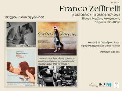 Τα 100 χρόνια από τη γέννηση του σπουδαίου Ιταλού δημιουργού Franco Zeffirelli – Φράνκο Τζεφιρέλι θα τιμηθούν στην Αθήνα με πρωτοβουλία του Ιταλικού Μορφωτικού Ινστιτούτου Αθηνών με μία έκθεση που θα λειτουργήσει από τις 18 έως τις 31 Οκτωβρίου 2023 στο Ίδρυμα Μιχάλης Κακογιάννης, στην Πειραιώς 206, ενώ προγραμματίζεται και η προβολή της ταινίας “Callas Forever” παραγωγής 2002, διάρκειας 108 λεπτών με τη Φανί Αρντάν στο ρόλο της Μαρίας Κάλλας.