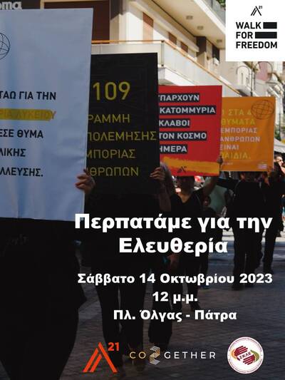 Η Διεθνής Οργάνωση Α21, το Περιφερειακό Τμήμα Δυτικής Ελλάδος του Συνδέσμου Κοινωνικών Λειτουργών Ελλάδος (ΣΚΛΕ) και η Co2gether διοργανώνουν στην πόλη της Πάτρας τη δράση "Περπάτημα για την Ελευθερία" (Walk For Freedom) που θα πραγματοποιηθεί αυτό το Σάββατο 14 Οκτωβρίου 2023 και ώρα 12:00 μμ. (πλατεία Όλγας, έναντι Εργατικού Κέντρου).