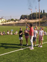 Στη συνέχεια, οι μαθητές της Ε΄ και της Στ΄ τάξης πραγματοποίησαν λαμπαδηδρομία εναρμονισμένη με το πνεύμα των Ολυμπιακών Αξιών, ανάβοντας τις δάδες τους από τη "ΦΛΟΓΑ ΤΟΥ ΕΥΖΕΙΝ".