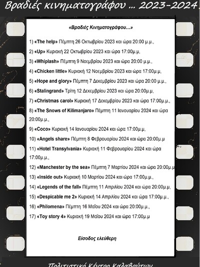 Ο Δήμος Καλαβρύτων ανακοινώνει ότι για δεύτερη συνεχή χρονιά θα πραγματοποιηθούν οι ‘’βραδιές κινηματογράφου...’’, στο Πολιτιστικό Κέντρο της ιστορικής και μαρτυρικής πόλης της ορεινής Αχαΐας.