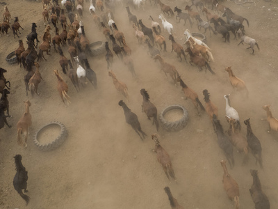 Εκεί, αφού θερίσει τη σοδειά, θα φτιάξει τα δεμάτια με σανό και θα τα μεταφέρει σε περιφραγμένη έκταση, μεγαλύτερη των 150 στρεμμάτων, όπου βρίσκονται τα εκατοντάδες άγρια άλογα της ελληνικής φυλής Πίνδου, που είναι όλα, όπως αναφέρειλ «τσιπαρισμένα»- αυτό θα διαρκέσει από τον Μάιο μέχρι τον Νοέμβριο. «Τα άλογα καταναλώνουν 15 με 20 τόνους τροφή την ημέρα. Ένα άλογο θέλει 15-20 κιλά την ημέρα. Τους θερινούς μήνες, τα ζώα βόσκουν ελεύθερα. Πηγαίνουν στο βουνό, όταν οι συνθήκες είναι καλές, υπό την επιτήρηση τεσσάρων βοσκών».