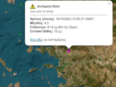 Σύμφωνα με το Γεωδυναμικό Ινστιτούτο, ο σεισμός εκδηλώθηκε 81.9 χμ ΒΑ της Σάμου σε εστιακό βάθος 10 χιλιομέτρων.