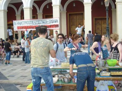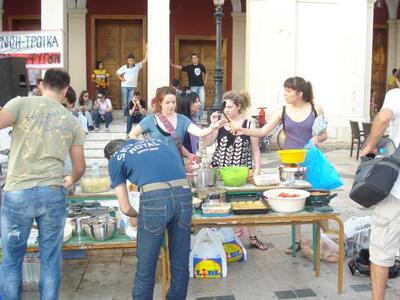 Επίσης χθες στην πλατεία στήθηκε ένας μπουφές με ποικίλα φαγητά, στο πλαίσιο της συλλογικής κουζίνας, που είχε σύνθημα: «Μαζί τα φέραμε μαζί θα τα φάμε», ενώ υπήρχε και θέατρο δρόμου.Oι αγανακτισμένοι έμειναν στην πλατεία Γεωργίου μέχρι αργά το βράδυ. Δείτε φωτογραφίες.