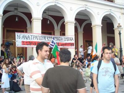 7.10 Δυναμική, με έντονο παλμό, μαζική, ειρηνική, ελπιδοφόρα. Η συγκέντρωση των αγανακτισμένων χθες στην Πάτρα, στο πλαίσιο του Πανευρωπαϊκού Ραντεβού των αγανακτισμένων, στέφθηκε με επιτυχία και υπολογίζεται ότι το παρών έδωσαν περίπου 6.000 άτομα κάθε ηλικίας, φοιτητές, άνεργοι, εργαζόμενοι, συνταξιούχοι, μητέρες με παιδιά, οι οποίοι θέλησαν με την παρουσία τους να εκφράσουν την αντίθεσή τους στη συνεχιζόμενη υποβάθμιση του βιοτικού επιπέδου της ζωής τους, ελέω... μνημονίου.