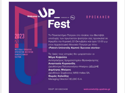 Το «Welcome to UP 2023», διοργανώνεται με πρωτοβουλία του Πανεπιστημίου Πατρών, με συνδιοργανωτές την Περιφέρεια Δυτικής Ελλάδας και το Επιμελητήριο Αχαΐας καθώς και με τη συνεργασία των Δήμων Πατρέων, Αγρινίου και Μεσολογγίου και την πολύτιμη συνεισφορά των χορηγών του.