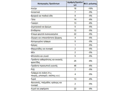 Ακολουθούν οι 21 κατηγορίες που εντάσσονται τα 233 προϊόντα καθώς και ο μέσος όρος μείωσης τιμής: