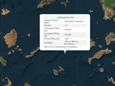 Σεισμική δόνηση έγινε αισθητός ανάμεσα τις Κυκλάδες και τα Δωδεκάνησα το απόγευμα της Πέμπτης 26 Οκτωβρίου.