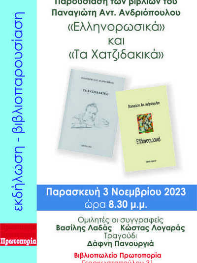 Στις 3 Νοεμβρίου 2023 στις 20.30 - Πρόκειται για τα βιβλία «Ελληνορωσικά» και «Τα Χατζιδακικά»