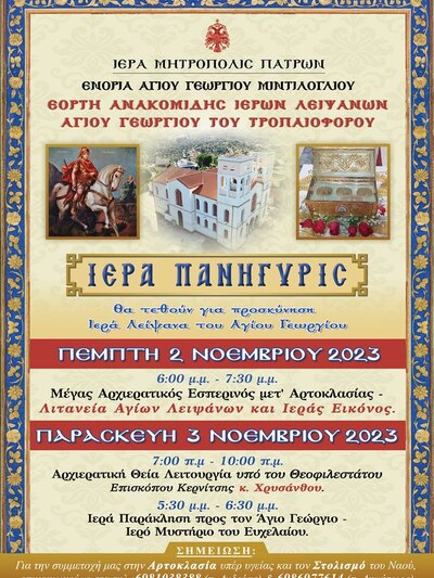 H ανακομιδή των ιερών λειψάνων του Αγίου Γεωργίου του Τροπαιοφόρου τιμάται από την εκκλησία μας στις 3 Νοεμβρίου 2023 και στον ομώνυμο ναό στο Μιντιλόγλι θα γίνει διήμερος εορτασμός. Απόψε Πέμπτη 2/11 παραμονή της εορτής στην Ενορία του Αγίου Γεωργίου Μιντιλογλίου Πατρών, η οποία & έχει την εξαιρετική ευλογία να κατέχει τμήμα του λειψάνου του Αγίου Γεωργίου, θα τελεστεί στις 18.00 Μέγας Πανηγυρικός Εσπερινός με Αρτοκλασία και θα ακολουθήσει λιτανεία των Ιερών Λειψάνων και της Εικόνας του Αγίου Γεωργίου.