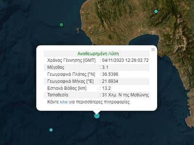Σεισμική δόνηση μεγέθους 3,1 βαθμών της κλίμακας Ρίχτερ σημειώθηκε στη θαλάσσια περιοχή νότια της Μεθώνης.