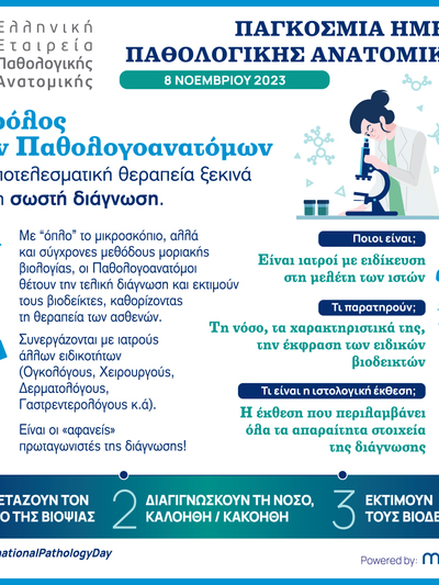 Με την ευκαιρία της Παγκόσμιας Ημέρας Παθολογικής Ανατομικής, στις 8 Νοεμβρίου 2023, η Ελληνική οικογένεια των Ιατρών Παθολογοανατόμων έρχεται, για μια ακόμη φορά, να συστηθεί και να ενημερώσει για τον εξαιρετικά σημαντικό ρόλο των Παθολογοανατόμων στην Ιατρική και στην περίθαλψη των ασθενών.