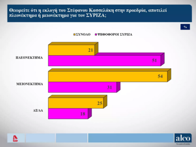 Όσον αφορά στην εκλογή του Στέφανου Κασσελάκη, το 21% του συνόλου των ερωτηθέντων εκτιμά ότι αποτελεί πλεονέκτημα για τον ΣΥΡΙΖΑ και το 54% μειονέκτημα.