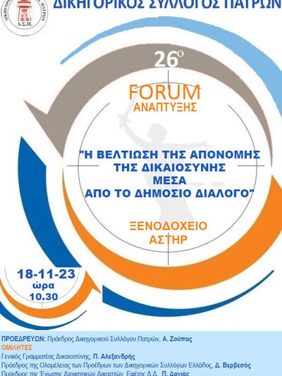 Στο πλαίσιο του 26ου Forum Ανάπτυξης, θα πραγματοποιηθεί το Σάββατο 18 Νοεμβρίου 2023 στις 10.30 το πρωί στο ξενοδοχείο Αστήρ, οδός Αγ. Ανδρέου και Αράτου, στην Πάτρα εκδήλωση με θέμα «Η βελτίωση της απονομής Δικαιοσύνης μέσα από το δημόσιο διάλογο». Την συγκεκριμένη εκδήλωση διοργανώνει ο Δικηγορικός Σύλλογος Πατρών.