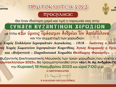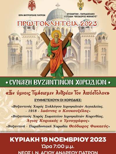 Στο πλαίσιο των Πρωτοκλητείων 2023, θα πραγματοποιηθεί μουσική σύναξη τριών (3) Βυζαντινών χορωδιών, την Κυριακή 19 Νοεμβρίου 2023, στον νέο Ι. Ν. Αγ. Ανδρέου Πατρών, στις 7.00 μ.μ., με τίτλο «Εν ύμνοις τιμήσωμεν Ανδρέαν τον Απόστολον».