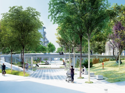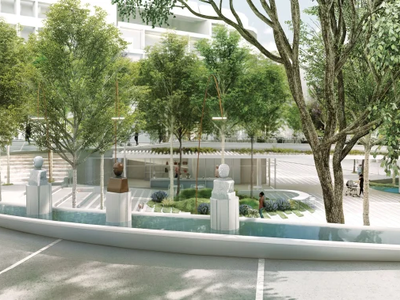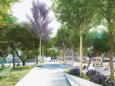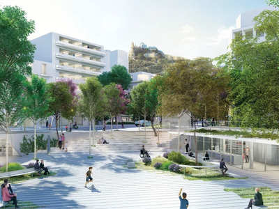 » Η μεγάλη υψομετρική διαφορά από βορά προς νότο λύνεται διατηρώντας απρόσκοπτες τις προσπελάσεις, διαμορφώνοντας δύο πλατώματα-επίπεδα. Δημιουργείται με αυτόν τον τρόπο ένας ενιαίος επίπεδος χώρος πλατείας στο χαμηλότερο επίπεδο που δίνει δυνατότητες για πολλαπλές χρήσεις, με περίπτερο, χώρους για καφέ και υπαίθριο ανθοπωλείο, χώρους στάσης και αναμονής, εκδηλώσεων, κίνησης κλπ. Το δαχτυλίδι του belvedere από πάνω είναι το πιο ισχυρό στοιχείο του σχεδιασμού, συνδυάζοντας τον περίπατο σε ένα πρωτόγνωρο αστικό επίπεδο, αλλά και ένα στέγαστρο εισόδου στον σταθμό του μετρό.
