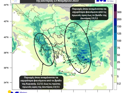 Bροχές και καταιγίδες θα σημειωθούν στο σύνολο σχεδόν της χώρας με τα ισχυρότερα φαινόμενα να αναμένονται στο Ιόνιο, στην Ήπειρο, στη Δυτική Στερεά και στη Δυτική Πελοπόννησο. Από το μεσημέρι οι βροχές και οι καταιγίδες αναμένεται να περιοριστούν κυρίως στη Θράκη, στο Αιγαίο και στην Κρήτη όπου όμως θα είναι κατά τόπους ισχυρές. Από τις βραδινές ώρες τα φαινόμενα θα εξασθενήσουν σημαντικά και στις περιοχές αυτές.